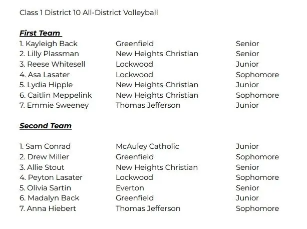 Below is the All-Class 1 District 10 volleyball team as voted on and submitted by the coaches.