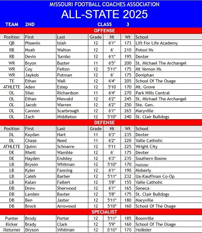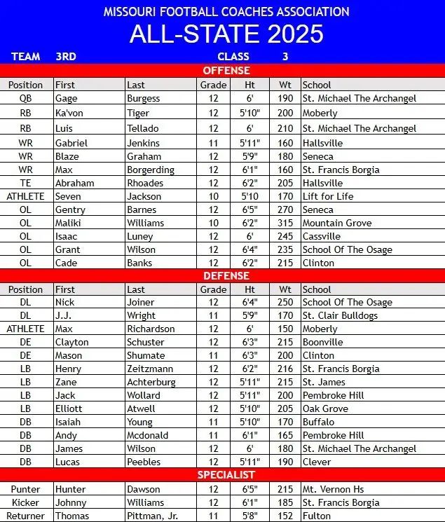 The Class 3 All-State football team as voted on by the Missouri Football Coaches Association has been released.