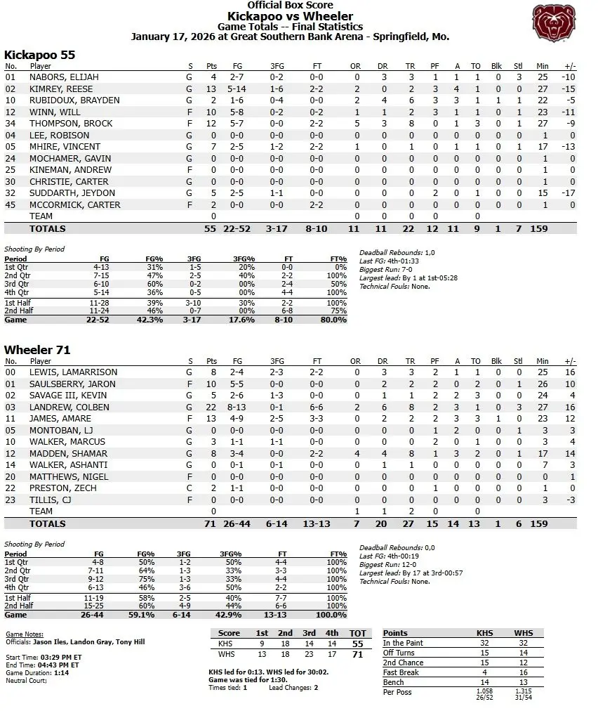 BOX SCORE: Wheeler 71, Kickapoo 55