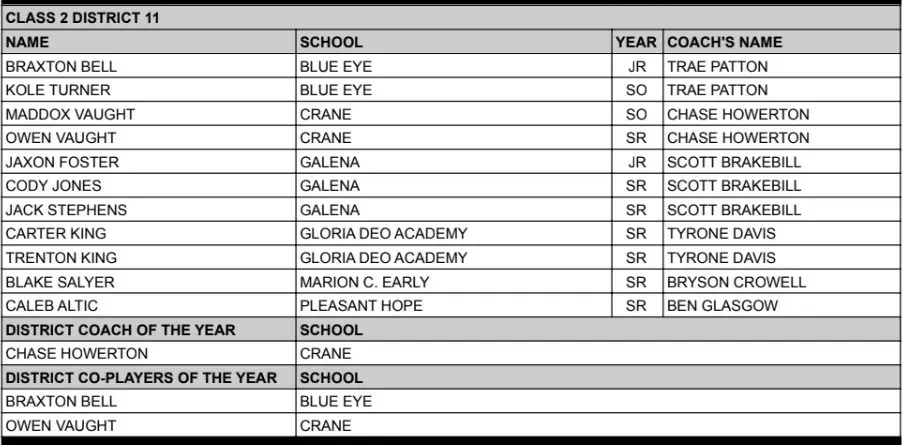 The All-Class 2 District 11 boys basketball team is below. This team was voted on by the MBCA.